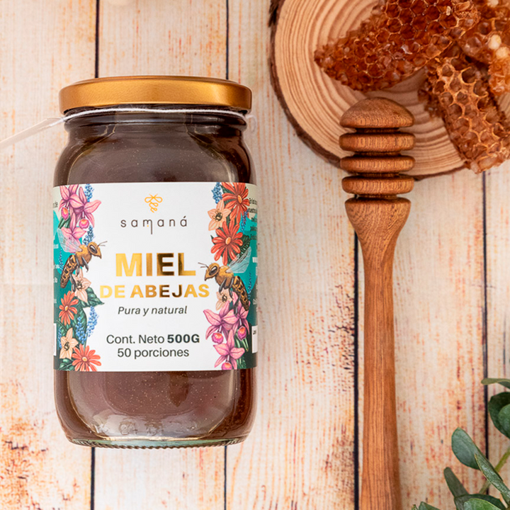 Te presentamos nuestra miel 100% pura y cruda, su sabor es dulce y floral gracias a las flores que visitaron las abejas en los diferentes bosques colombianos.